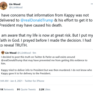Lin Wood is a piece on a chess board. His job is to put pressure on Chief Justice John Roberts and cause a stir. Misdirection. His callouts do nothing else until he provides proof. Sydney Powell similarly has her part to play in putting pressure in key points. There is a method to this madness but it doesn't come without a price. It is causing massive credibility damage for Trump's camp in the eyes of Democrats we are trying to help see the truth. A truth so heinous and ugly to face. This gives Democrats the excuse to dismiss the truth they struggle to hide from with all their might anyway. And they will use it! The CIA did a…