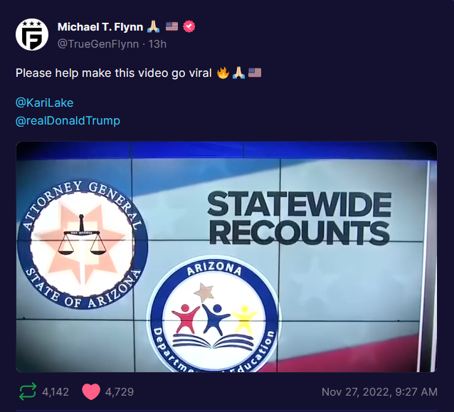 Arizona- Hold The Line!RoosterNov 28, 20221 min read https://truthsocial.com/users/TrueGenFlynn/statuses/109416235177278301